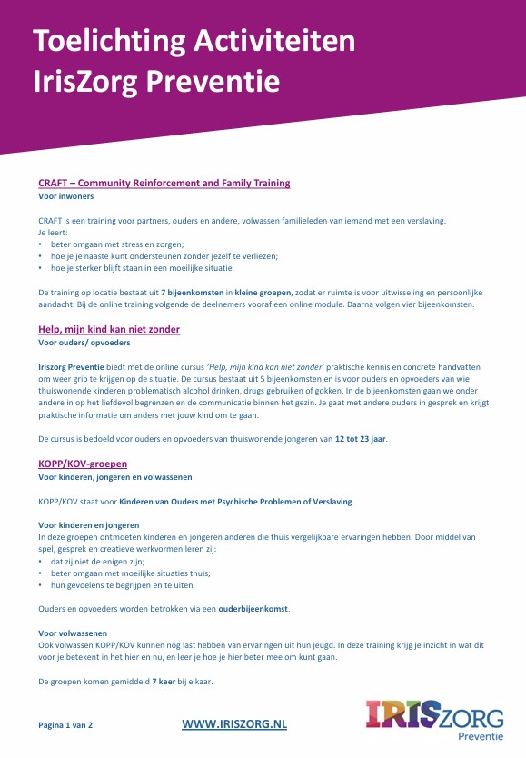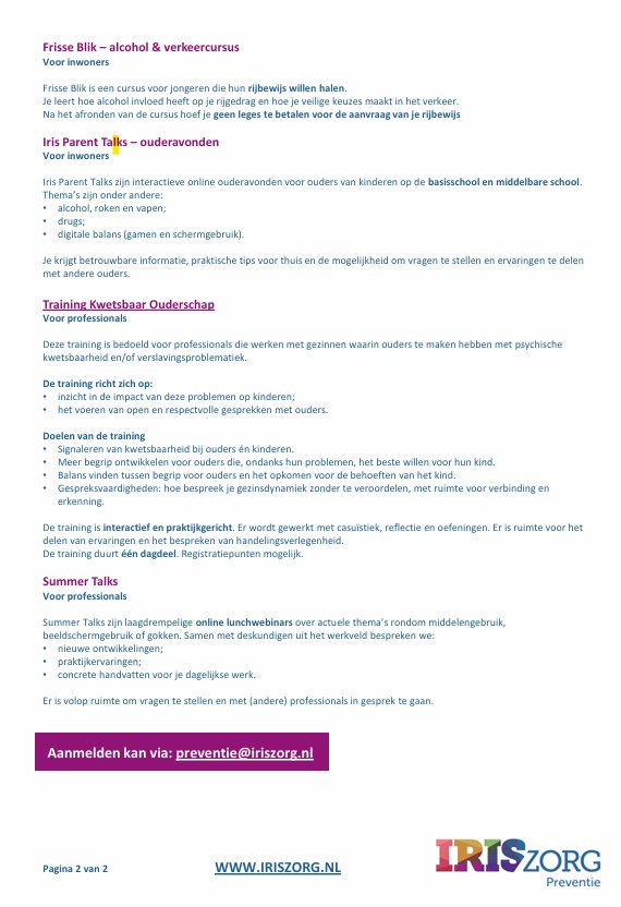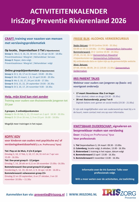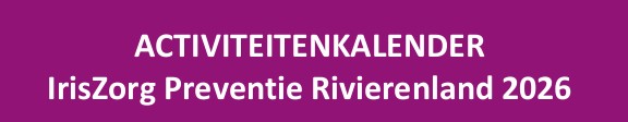 ACTIVITEITENKALENDERIrisZorg Preventie Rivierenland 2026 Vorige Activiteiten Opvoedavonden 'Eerste Hulp Bij Opgroeien'. Volgende Activiteiten Thema-café in De Voorhof in Kesteren.
