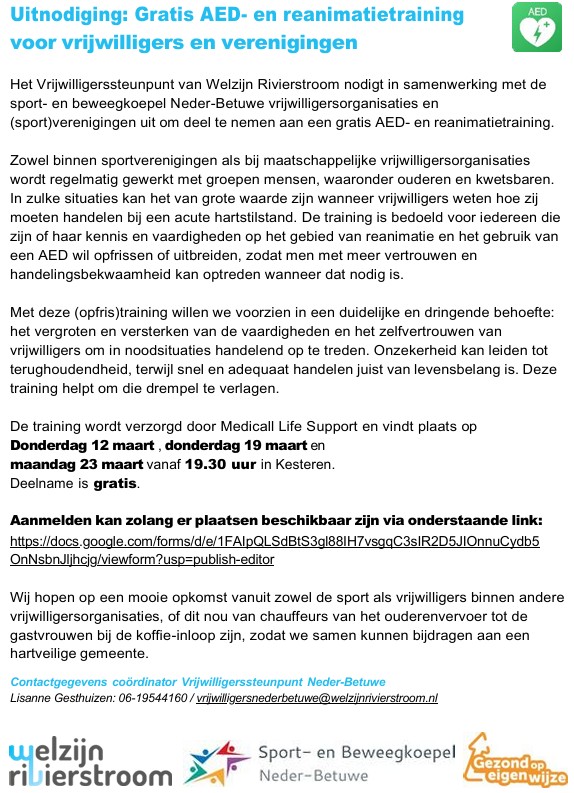 KESTEREN: Het Vrijwilligerssteunpunt Neder-Betuwe organiseert in samenwerking met de Sport -en beweegkoepel en Gezond Op Eigen Wijze een AED -en reanimatietraining. Alle vrijwilligers actief in Neder-Betuwe – van vrijwilligers bij sportverenigingen tot chauffeurs voor het ouderenvervoer, bestuursleden of gastvrouwen bij de koffie-inloop- mogen kosteloos meedoen.