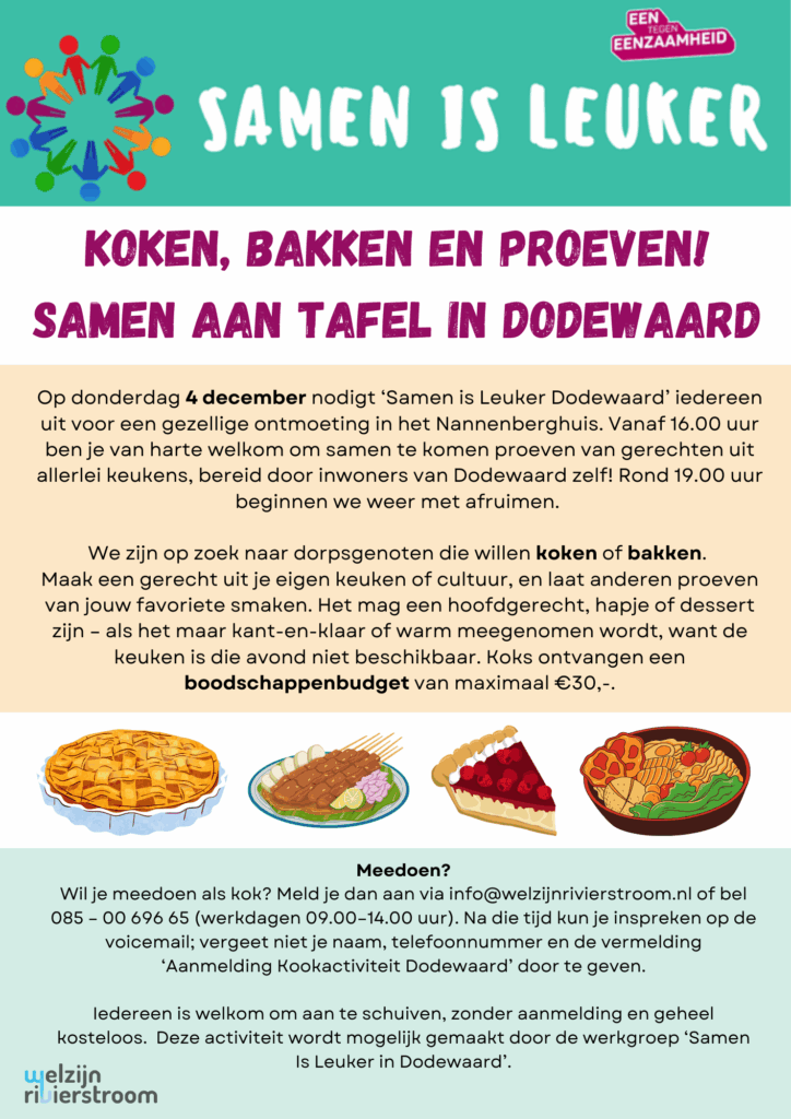 Wil je meedoen als kok? Meld je dan aan via info@welzijnrivierstroom.nl of bel 085 – 00 696 65 (werkdagen 09.00–14.00 uur). Na die tijd kun je inspreken op de voicemail; vergeet niet je naam, telefoonnummer en de vermelding ‘Aanmelding Kookactiviteit Dodewaard’ door te geven. Ben je geen keukenprins(es) maar houd je wel van lekker eten en gezelligheid? Kom gewoon mee-eten! Iedereen is welkom om aan te schuiven, zonder aanmelding en geheel kosteloos. Deze activiteit wordt mogelijk gemaakt door de werkgroep ‘Samen Is Leuker in Dodewaard’. Samen maken we er een warme, smakelijke en verbindende avond van!