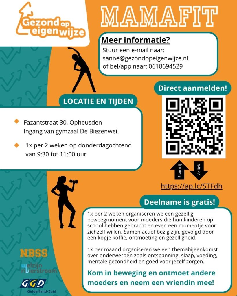Mamafit is gratis en is één keer per 2 weken op donderdag van 9.30-11.00 uur in de Snellenburg in Opheusden. Adres: Fazantenstraat 30 in Opheusden (ingang van gymzaal de biezenwei).