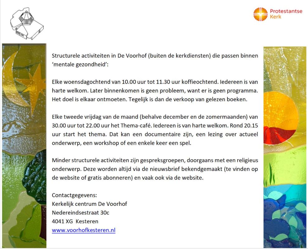 Structurele activiteiten in De Voorhof (buiten de kerkdiensten) die passen binnen ‘mentale gezondheid’.