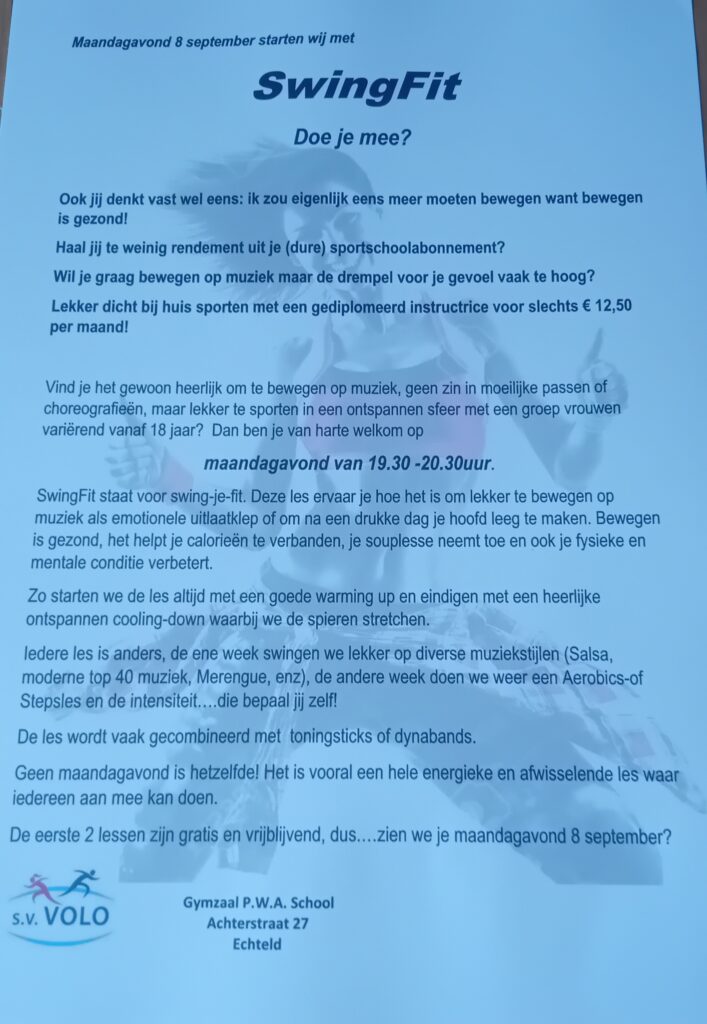 De lessen zijn vanaf 8 september elke maandagavond van 19.30 tot 20.30 uur op locatie van de gymzaal van de PWA school in Echteld (Achterstraat 27). Zie ook onderstaande flyer en bezoek eens de website van s.v. VOLO via: https://www.volo-echteld.nl/index.php/contact