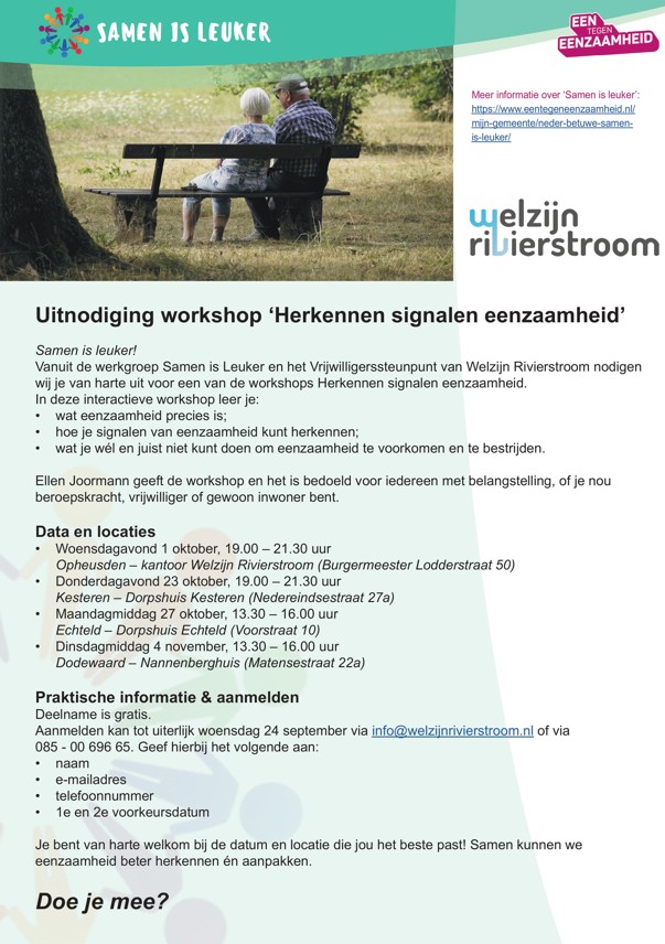Uitnodiging workshop ‘Herkennen signalen eenzaamheid’ Samen is leuker!Vanuit de werkgroep Samen is Leuker en het Vrijwilligerssteunpunt van Welzijn Rivierstroom nodigen…