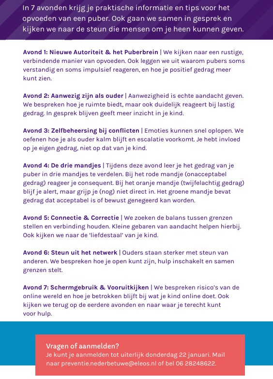 Aanmelden kan tot en met D.V. 24 januari 2026 via preventie.nederbetuwe@eleos.nl. Meer informatie vindt u op eleos.nl/nederbetuwe.